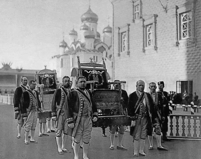 39. Придворные переносят царский трон в Большой Кремлевский дворец во время подготовки к коронации Николая II, 1896 г.