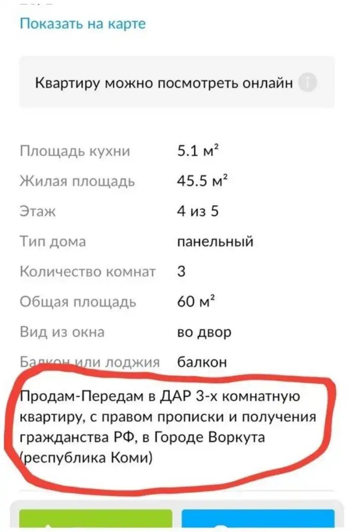 Из объявления - «Даром. 4-х комнатная квартира. Светло, тепло, уютно. Новая сантехника, новые счетчики на свет, горячую и холодную воду. Мебель, холодильник, тв остаются. Без долгов, без обременений и ограничений по сделки купли-продажи. Во дворе школа, рядом садик».