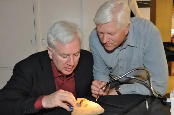 Бедренная кость ископаемого слона рядом со скелетом человека.