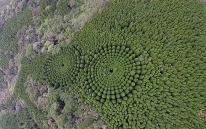 Фото кругов из деревьев породили в интернете не мало вопросов, а также распространили всяческие теории заговора. На самом деле эти деревья - результат эксперимента длиной в 50 лет. Для того чтобы проверить влияет ли плотность посадок на рост саженцев кедры посадили кругами с уменьшающимся расстоянием между кругами. Как видите эксперимент наглядно показал, что чем меньше расстояние, тем ниже деревья - в центре самая плотная посадка и там деревья меньше своих собратьев по краю. Эксперимент проведен в Японии