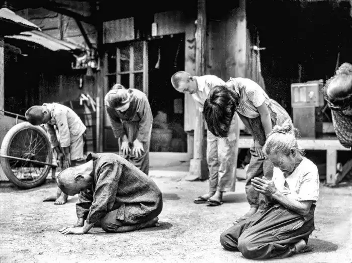 Японцы слушают сообщение императора о капитуляции. Япония, 1945 год.