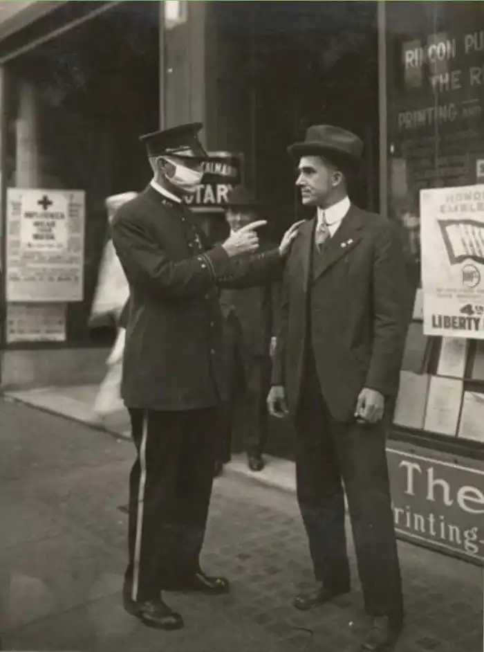 Полицейский в Сан-Франциско делает выговор мужчине за то, что он не носит маску во время пандемии гриппа, 1918 год.