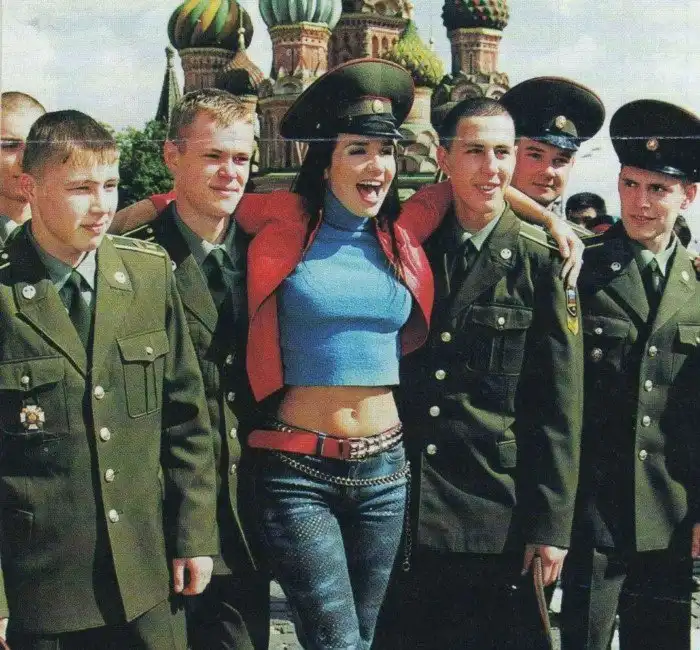 3. Певица и актриса Наталья Орейро и юные курсанты на Красной площади, 2001 год. Это первый визит «Дикого ангела» в Россию. Кстати, сейчас Орейро ожидает получение российского паспорта и обещает быть «более русской, чем Жерар Депардье»
