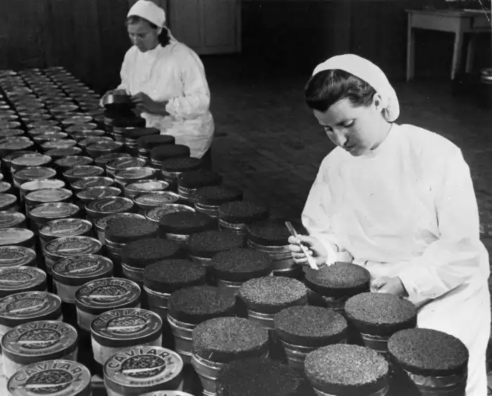5. Ҡонтролеры А. Андреева и М. Мысова проверяют качество икры перед упаковкой на экспорт. Отделение Кировского рыбного хозяйства в Азербайджане, 1947 год