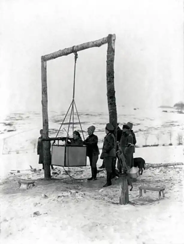 16. Пилоты на одной из разновидности авиационного тренажера. Российская Империя. 1915 год.