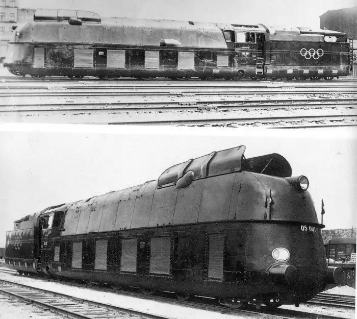 27. Скоростной пассажирский паровоз BR-05 предназначенный для вождения экспрессов. В 1936г. паровоз BR-05 (002) установил рекорд скорости для германских паровозов - 200,4 км/ч. BR05001 - официальный паровоз немецких олимпийских игр 1936 года.
