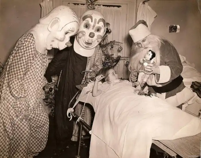 33. Клоуны и Санта веселят девочку в больнице. 1950 год