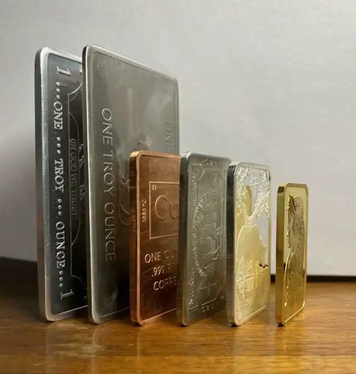 Слитки чистых металлов на 1 унцию (28 г) разного размера: алюминий, титан, медь, никель, серебро, золото