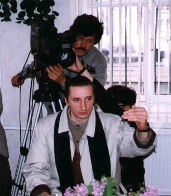 18. Певица «Линда» со своим продюсером Максимом Фадеевым дают интервью местной газете, Россия, 1996 год