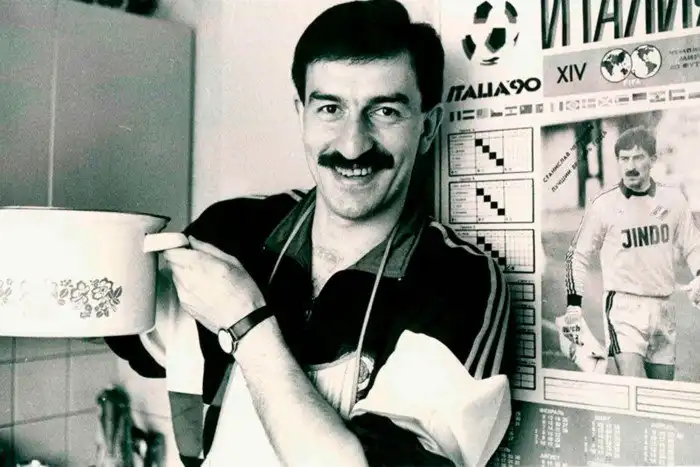 22. Тренер сборной России Станислав Черчесов радостно держит кастрюлю с супом, на тот момент вратарь сборной СССР, 1990 год