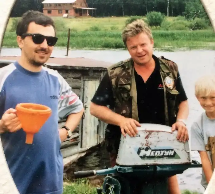 36. Лучший друг детей 90-х Сергей Супонев отдыхает с друзьями на рыбалке, Россия, 1998 год