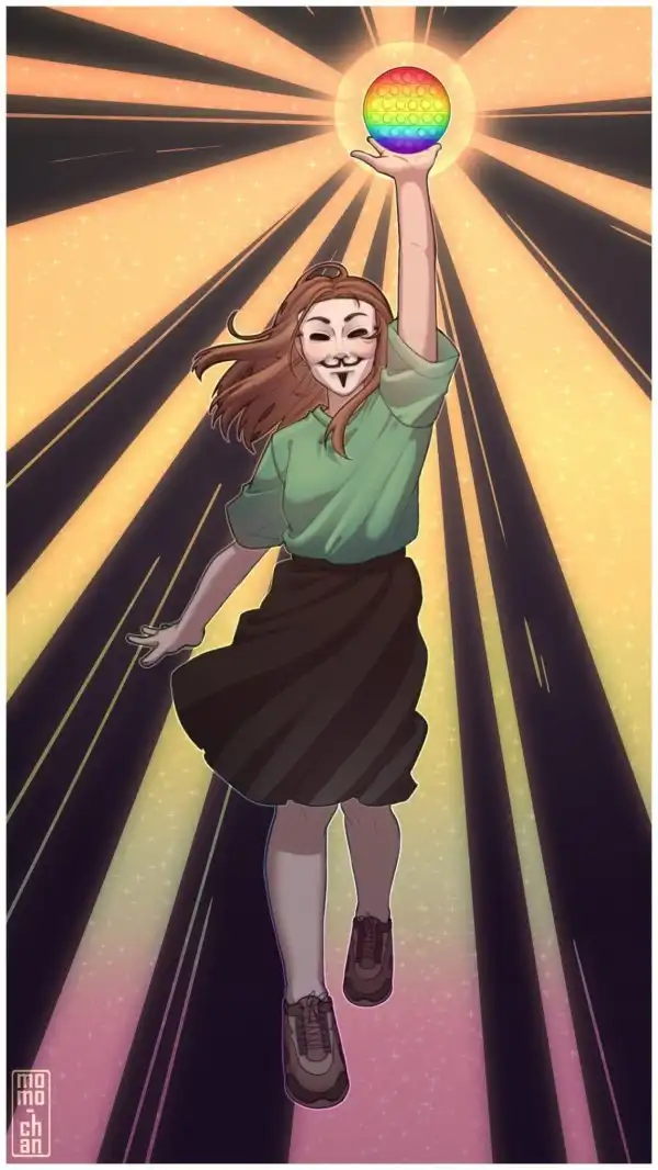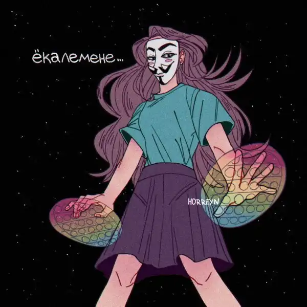 Когда в 2006 году вышел фильм "V — значит вендетта", все страны захватила мания Гая Фокса. Каждый второй побежал покупать себе его знаменитую маску Анонимуса. Но их популярность среди взрослых уже давно прошла, однако детишки по-прежнему в восторге от этой маски. Так в Сети завирусилась фотография девочки, которая буквально объединила самые популярные товары разных поколений: игрушку "поп-ит" и маску Анонимуса. Фото получилось таким загадочным и атмосферным, что художники из Сети сразу же вдохновились на творчество.