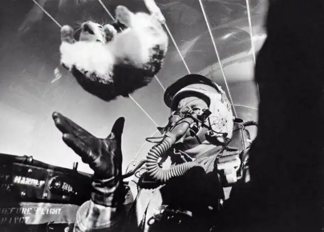 Пилот выполняет опыт по изучению действия невесомости на кошке, 1958 год.