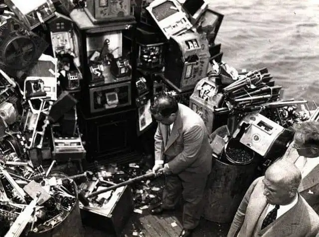 Мэр Нью-Йорка Фьорелло Ла Гуардиа разбивает кувалдой конфискованные игровые автоматы на борту полицейской лодки в Нью-йоркской гавани, 10 октября 1934 года.