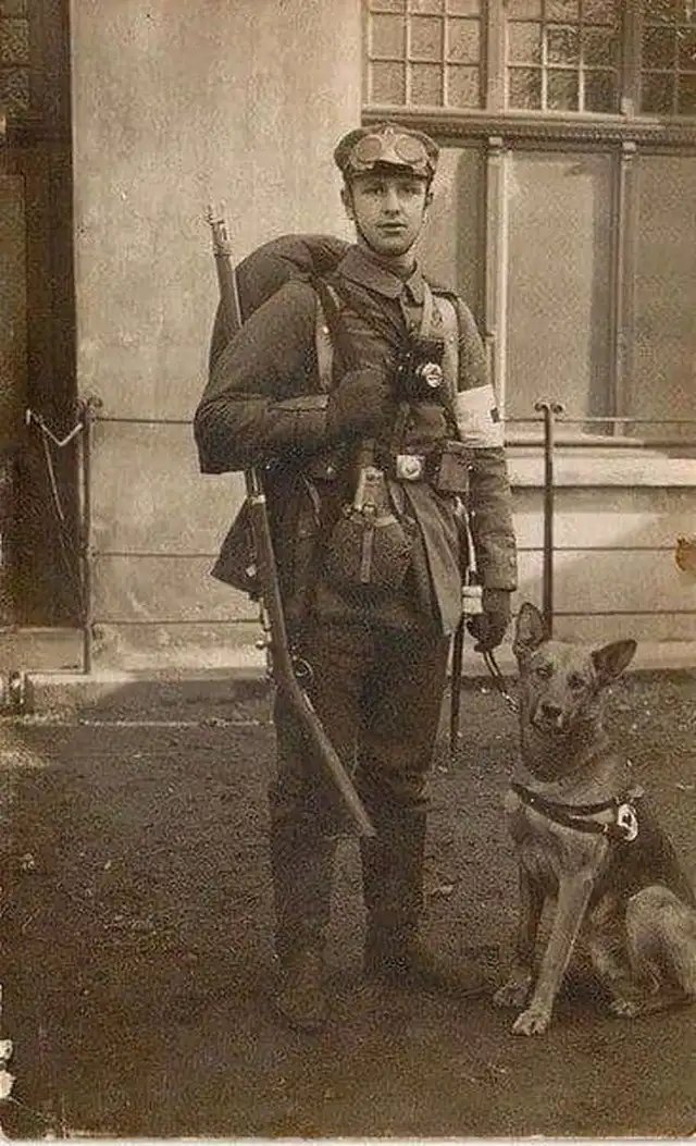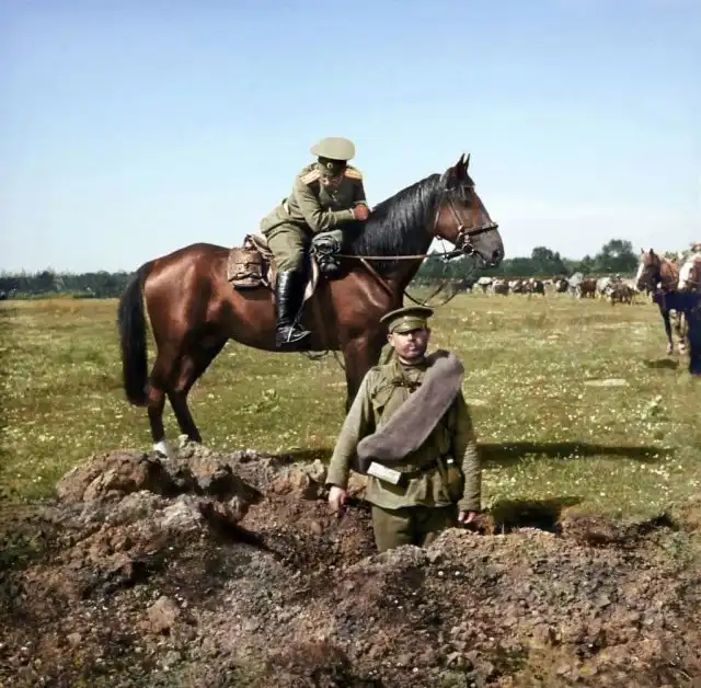 Российский солдат стоит в воронке от снаряда. Первая мировая война, 1914 год.