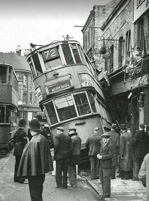 6. Ранним апрельским утром 1946 года трамвай линии "Уоркмэн" превысил безопасную скорость, сошел с рельсов на перекрестке и врезался в здание на Вулидж-Нью-Роуд (район Гринвич, Лондон).