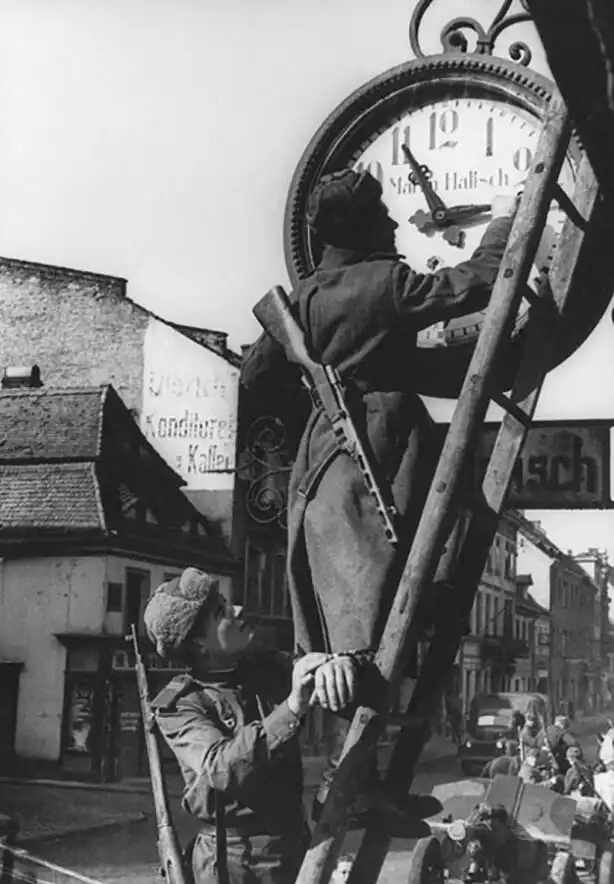 22. Советские солдаты переводят стрелки часов в немецком городе Ноймаркт, Германия, 1945 год.