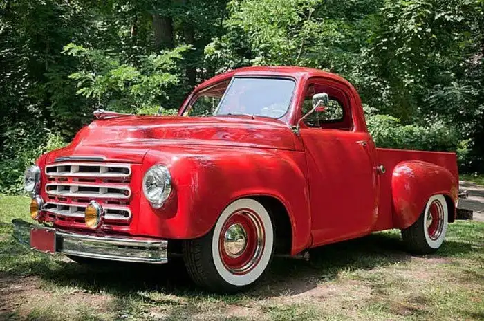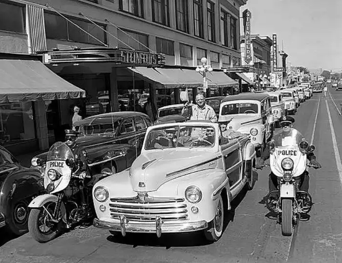 10. Ford Super DeLuxe 11. 1947 года с откидным верхом ведет парад новых автомобилей Ford перед универмагом Штайнфлед на Стоун-авеню в Тусоне, штат Аризона.
