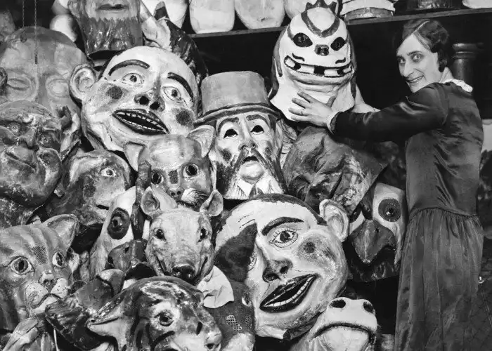 19. Женщина расставляет головы для пантомимы в кладовой на лондонской фабрике, 11 ноября 1929 года. Головы будут использоваться в рождественских пантомимах.