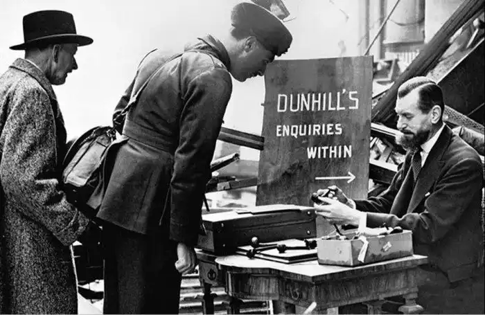 6. Альфред Данхилл продает трубки на улице перед руинами своего магазина, Лондон, Англия, 1944 год