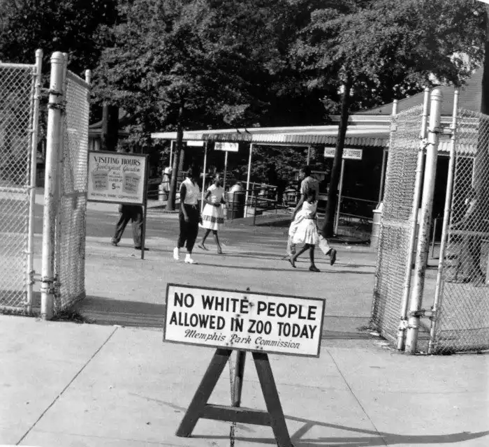 15. На табличке — надпись "белые люди сегодня не могут войти в зоопарк". Такая табличка выставлялась перед зоопарком в Мемфисе лишь один раз в неделю. Остальные шесть дней, только "белым" и можно было в этот зоопарк.