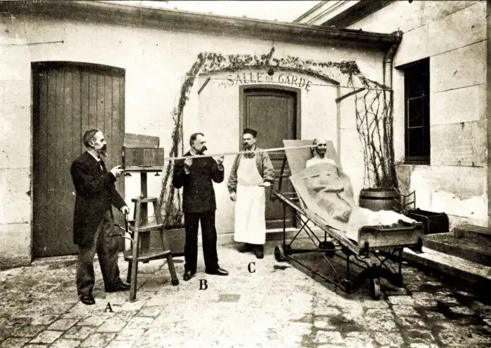 22. Демонстрируется метод фотографирования трупа как часть идентификации личности перед вскрытием. 1880–е годы, Франция
