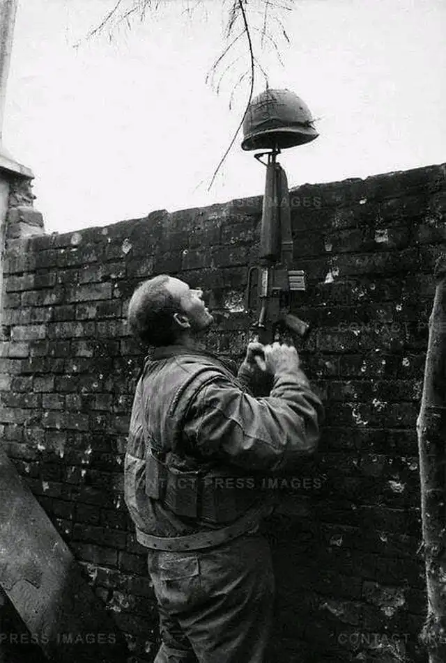 Морской пехотинец США провоцирует вражеского снайпера. Наступление Тет. Битва за Хюэ. Вьетнам. Февраль 1968г.