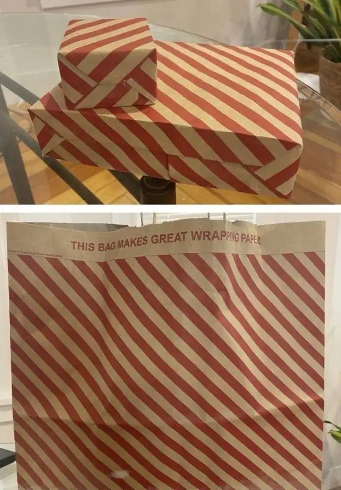 2. "На моей сумке для покупок напечатан праздничный узор, поэтому ее можно повторно использовать в качестве оберточной бумаги"