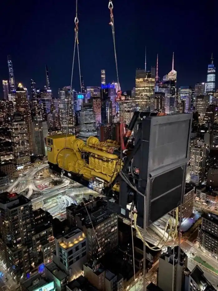 8. Генератор весом 17,5 тонн поднимается на высоту 52 этажа с помощью крана в Нью-Йорке