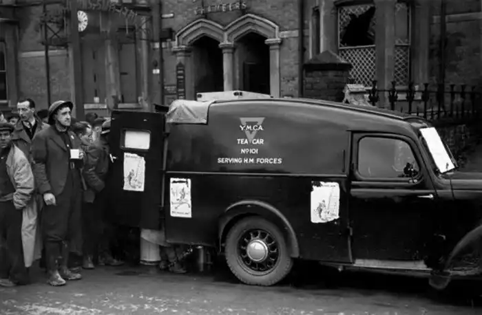 19. После ночной бомбардировки, чайная машина подает чай для спасателей, Англия, Ковентри, 1940 год