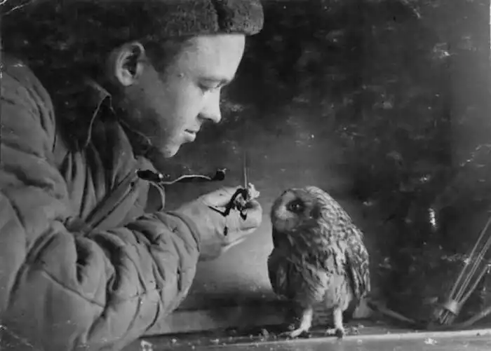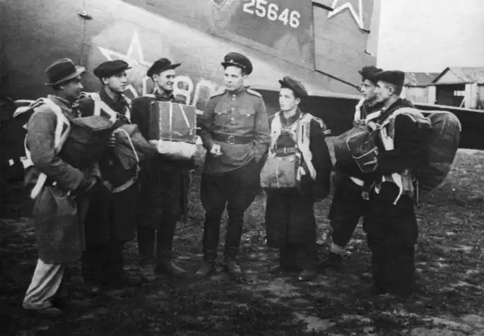 30. Начальник школы особого назначения Украинского штаба партизанского движения Павел Выходец (в форме) дает последние инструкции выпускникам школы перед заброской их через линию фронта. Ровно. УССР. СССР. 1944 год.