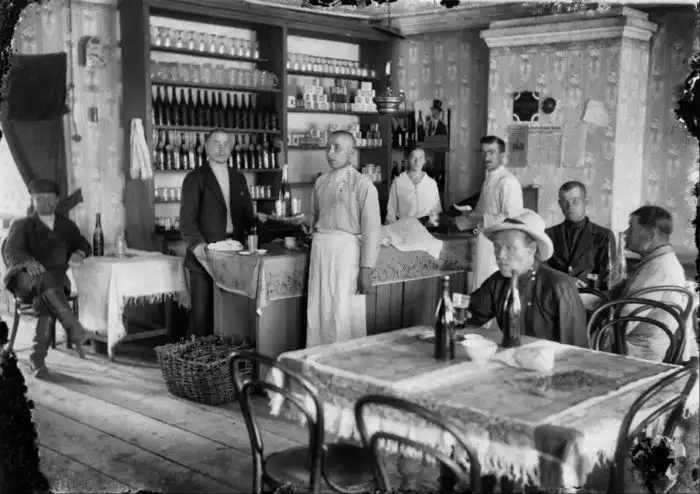Почему такое название, если там продают алкоголь? Всё дело в том, что в русских чайных до 1917 года действительно продавали лишь чай и сопутствующие продукты. Запрещалось продавать вино, водку, пиво. После 1917 года запрет на продажу алкоголя сняли, а название осталось.