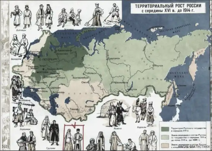На следующей странице вы можете увидеть рост территории нашей страны, начиная с XVI века. Зеленой линией выделены границы страны в 1914 году.
