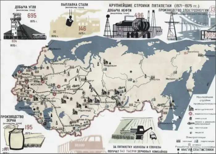 На этой странице мы можем увидеть промышленность и сельское хозяйство СССР: добычу угля, нефти, выплавку стали, производство зерна и многое другое