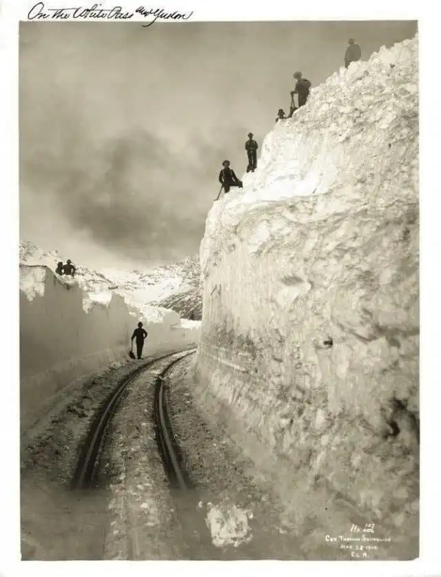 Рабочие очищают от снега железную дорогу, Аляска, 1904 год.