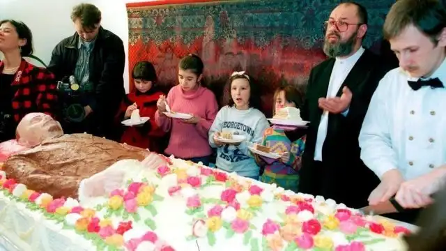Дети 1990-х разрезают торт формы Ленина на мeроприятии «Ленин в тебе и во мне». Москва, 1998 год.