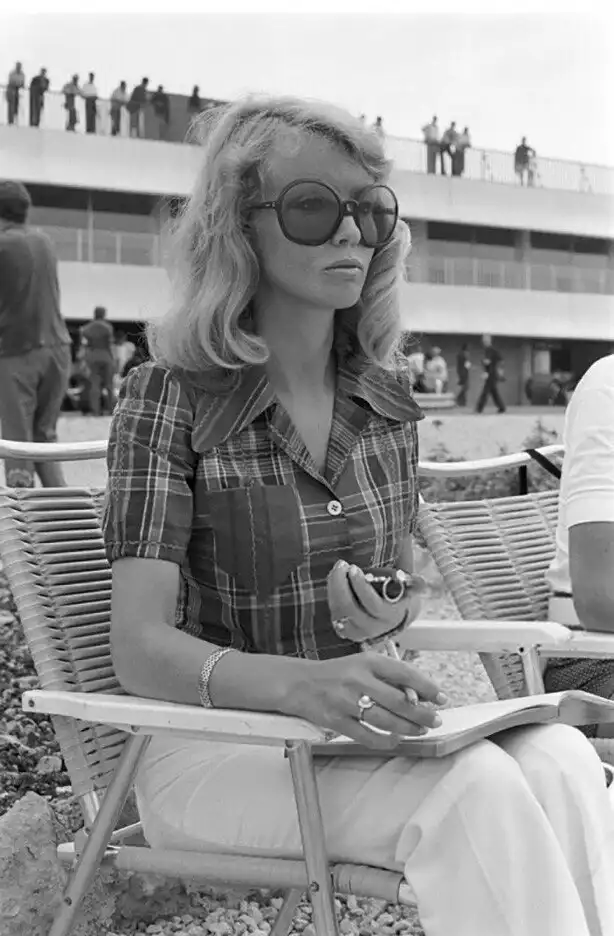10. 4 июля 1971 года. Формула 1, трасса Поль Рикар, Гран-при Франции. Барбро Петерсон, жена гонщика Рони Петерсона с секундомером наблюдает за гонкой.