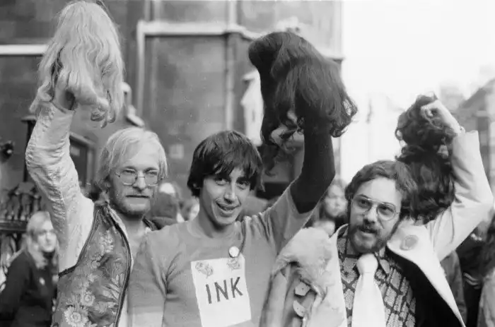 31. 3 ноября 1971 года. Джим Андерсон, Ричард Невилл и Феликс Деннис после того, как центральный уголовный суд Олд-Бейли отменил их приговоры по обвинению в заговоре с целью развращения общественной морали.