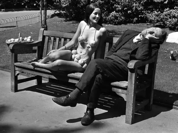 37. 13 июля 1971 года. Модель в бикини из апельсиновых корок и спящий мужчина на скамейке в лондонском парке. Возможно, фото не постановочное.