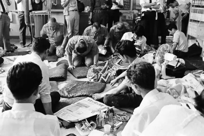 73. 31 июля 1971 года. Командование Воздушных сил самообороны Японии кланяется перед родственниками погибших пассажиров рейса 58 All Nippon Airways, признавая свою вину за катастрофу.