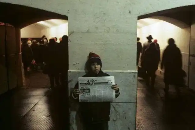 Беспризорник продаёт газету в одном из московских переходов, 90-е