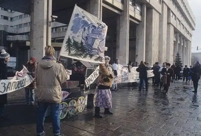 Акция радикального экологического движения "Хранители радуги" у здания Российского информационного агентства "Новости" против строительства скоростной железнодорожной магистрали Москва — Санкт-Петербург, март 1996 года.