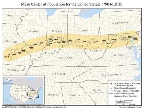 Средний центр населенности США постепенно смещался на запад с 1790 года и на юг каждый год с момента появления кондиционеров в 1920-х годах