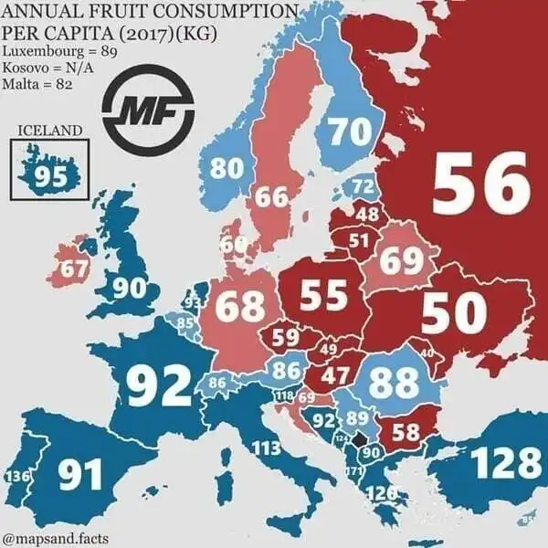 13. Годовое потребление фруктов в кг на душу населения в Европе