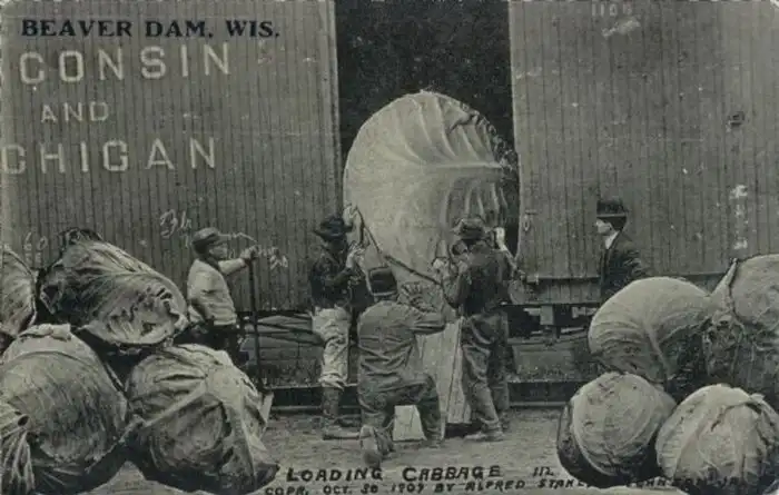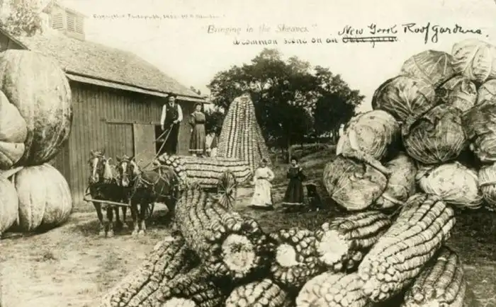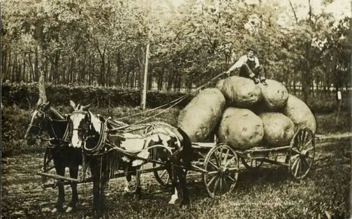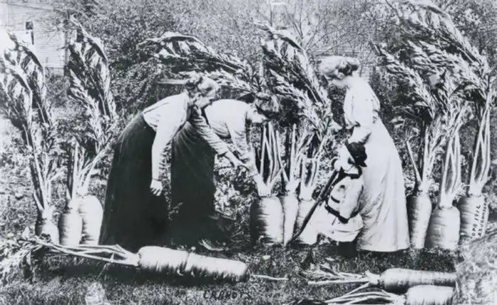 И эти фотоколлажи с гигантскими морковкой, капустой и картошкой, которые сейчас больше напоминают иллюстрации к жизни коротышек из книг про Незнайку, являлись на самом деле свидетелем эпохи и тех устремлений, которыми руководствовались люди того времени. В данном случае - жители США, которые снова ехали покорять новые земли.