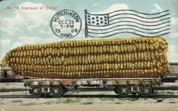 Затем этот способ стал получать уже самостоятельное значение как художественный метод. И стал использоваться в том числе и для создания таких вот открыток. Для чего? Все такие коллажи изображали преувеличенное изобилие, которое обещалось тем, кто переедет жить в ту или иную местность - американские города или посёлки.