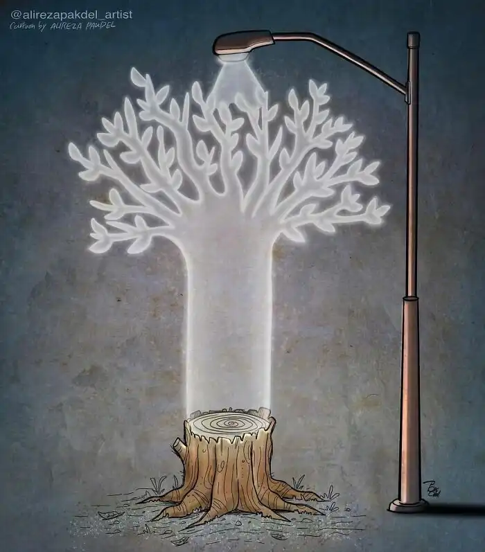Алиреза Пакдел (о котором мы уже рассказывали) - художник-карикатурист из Ирана. И он не в восторге от того мира, в котором мы живем... Его работы напоминают о важных вещах, которые мы обычно забываем за бытовой рутиной, но от которых все равно никуда не деться.