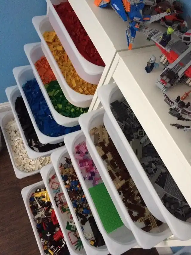 Ящики для деталей лего заметно разрешили вопрос с организацией пространства в детской