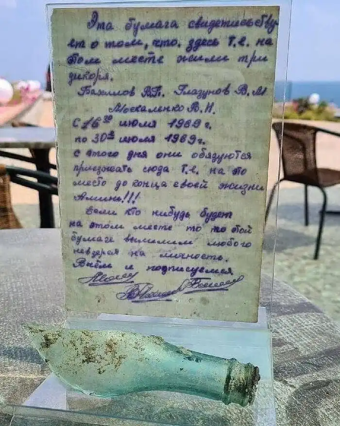 «Эта бумага свидетельствует о том, что здесь, то есть на этом месте жили три дикаря» — с этих слов начиналось послание. В нем говорилось, что некто Бахилов, Глазунов и Москаленко отдыхали в Крыму с 16 по 30 июля 1969 года. Трое парней поклялись, что будут приезжать на это место до конца своей жизни. «Надеюсь, те люди, которые оставили эту записку в бутылке, еще живы!» — заметили нашедшие исторический артефакт оренбуржцы.