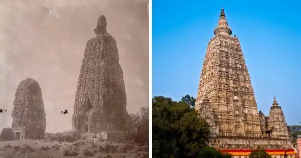 Буддийский храм Махабодхи, Индия: 1880-е годы и сейчас